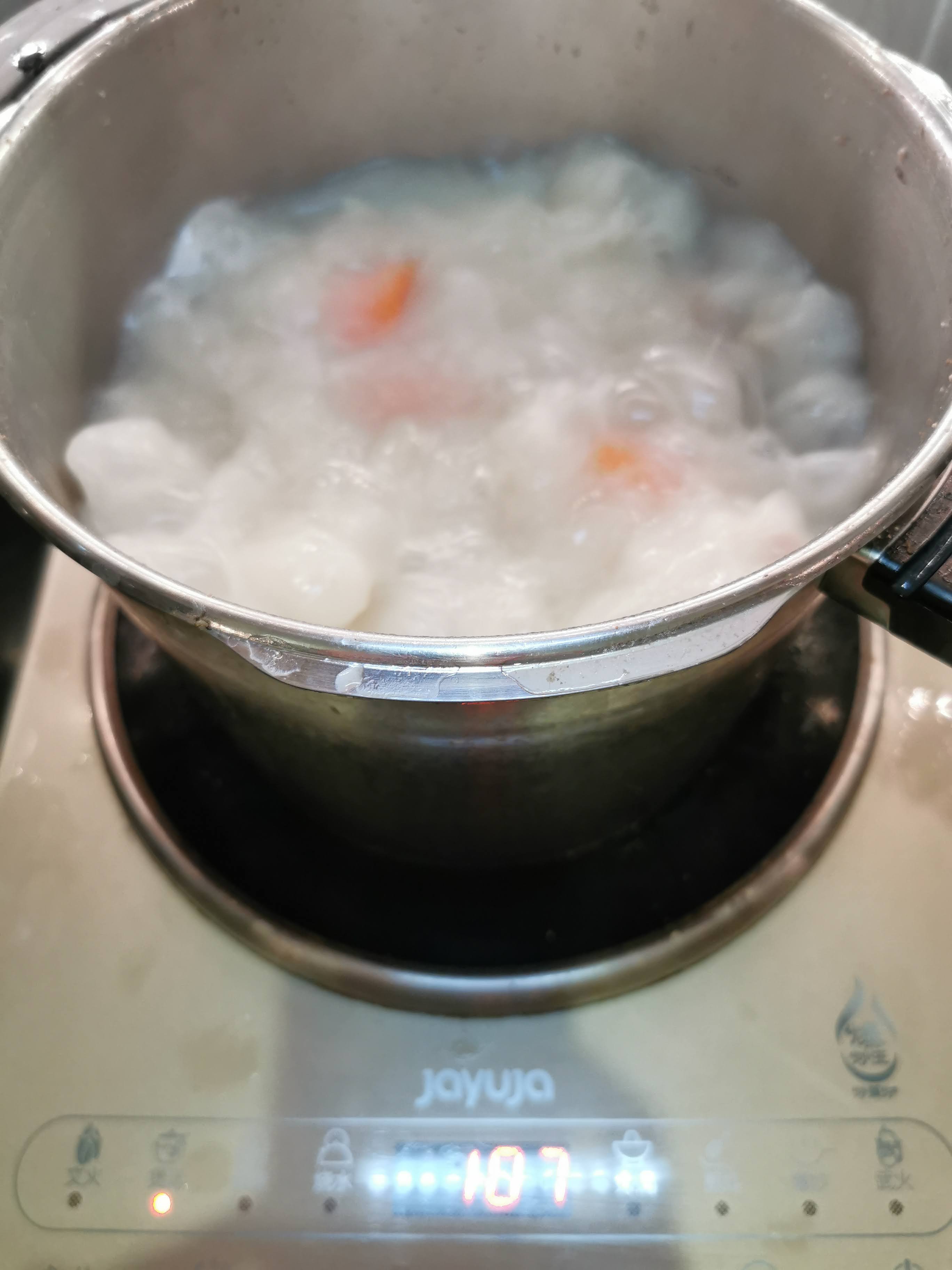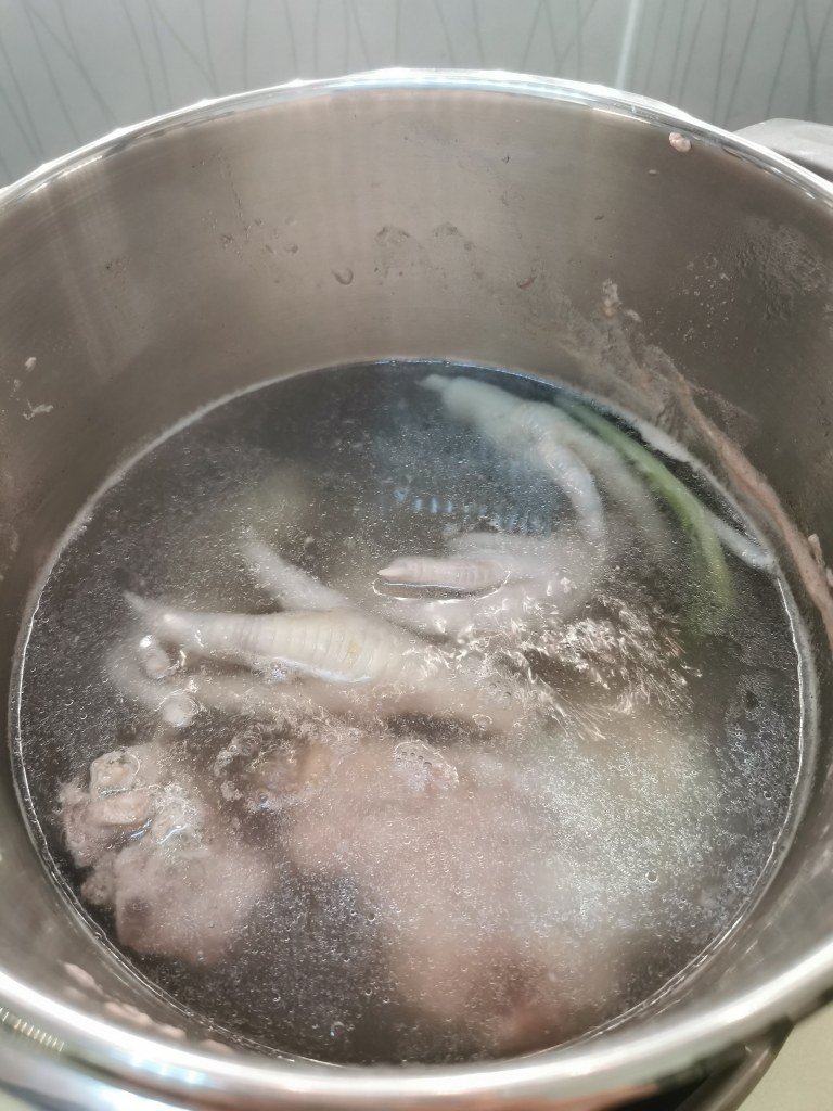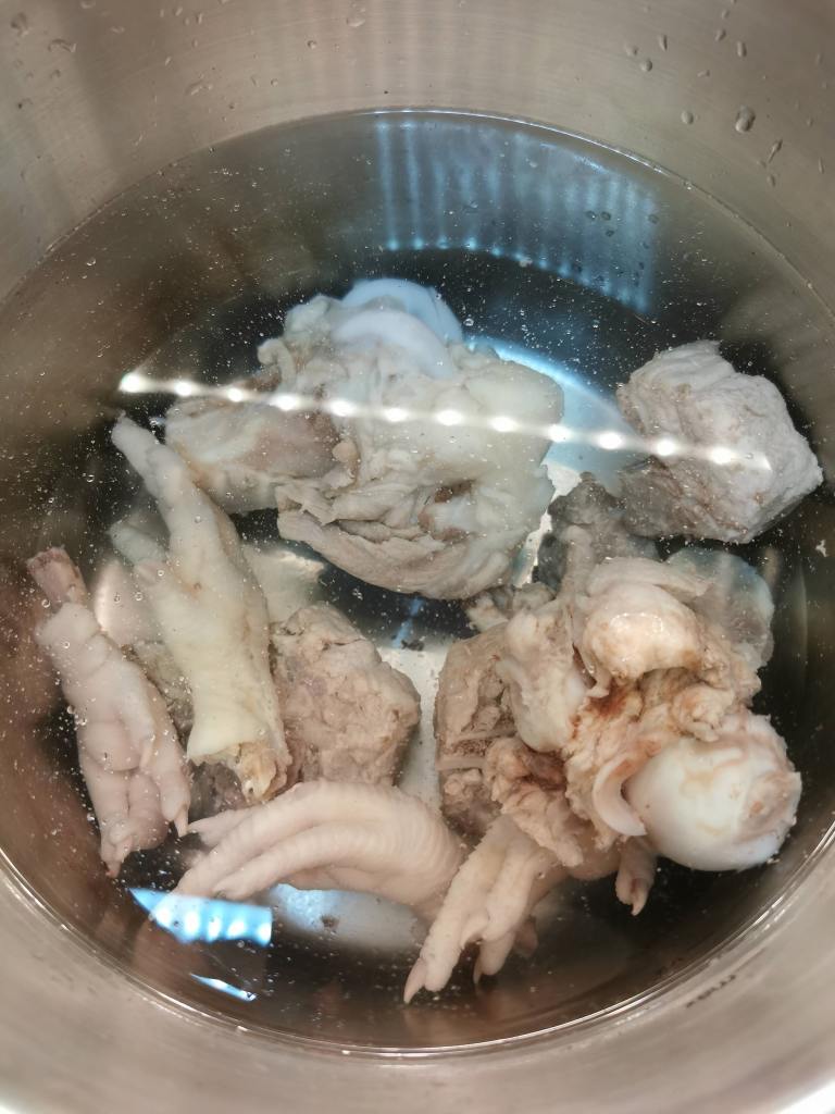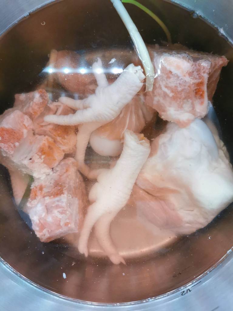 2. 準備高壓鍋,放入洗好的豬骨及清水,大火煮至滾,關蓋直至壓力鍋彈出第二條線,就轉最小火,煮1小時(如果特大鍋就要煮1.5小時),煮好後由它自然降壓 Prepare high pressure pot, then put the bones into clear water, then open high heat, cook until water boiling, then close the lid, turn to small heat, then cook for one hour (if your pot is too large, then cook for 1.5 hours), let it naturally seat until pressure is reduced.