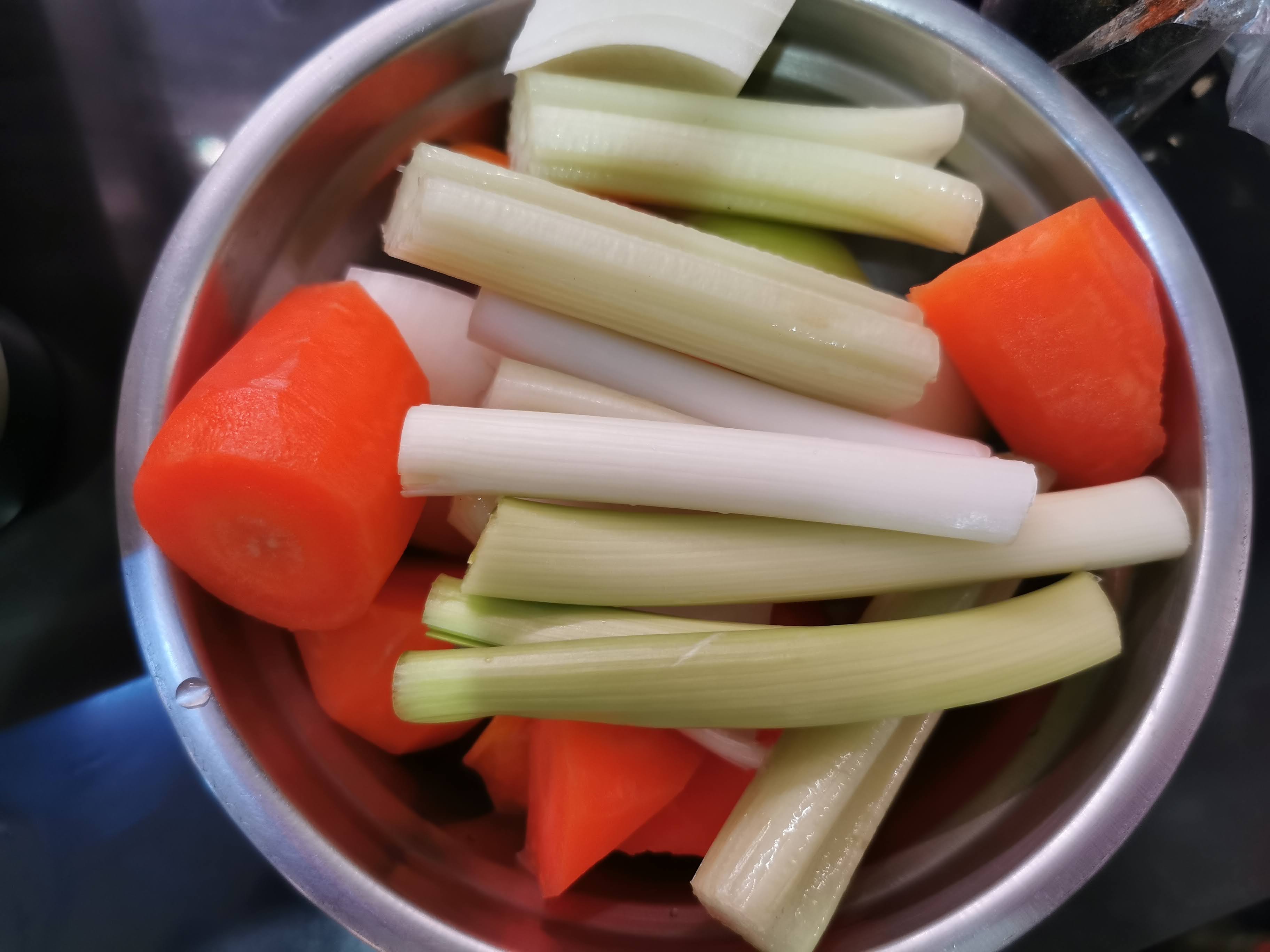 3. 把大蔥及西芹切段、紅蘿蔔及洋蔥切大切,放入剛煮好的豬肉湯,然後全程以最大火來滾豬骨一個小時(作者建議設鬧鐘,每次15分鐘看看及加水,防止乾水),在最後的15分鐘加入昆布繼續煮,完成後備用 Cut leeks, celery, carrot and onion into chunks, then put all into the pork bone broth, then use high heat all way through to cook it for another hour (suggested to set alarm to check every 15/20 mins to add water on it, to prevent burnt),put the seaweed for the last 15 minutes and continue to boil until finished.
