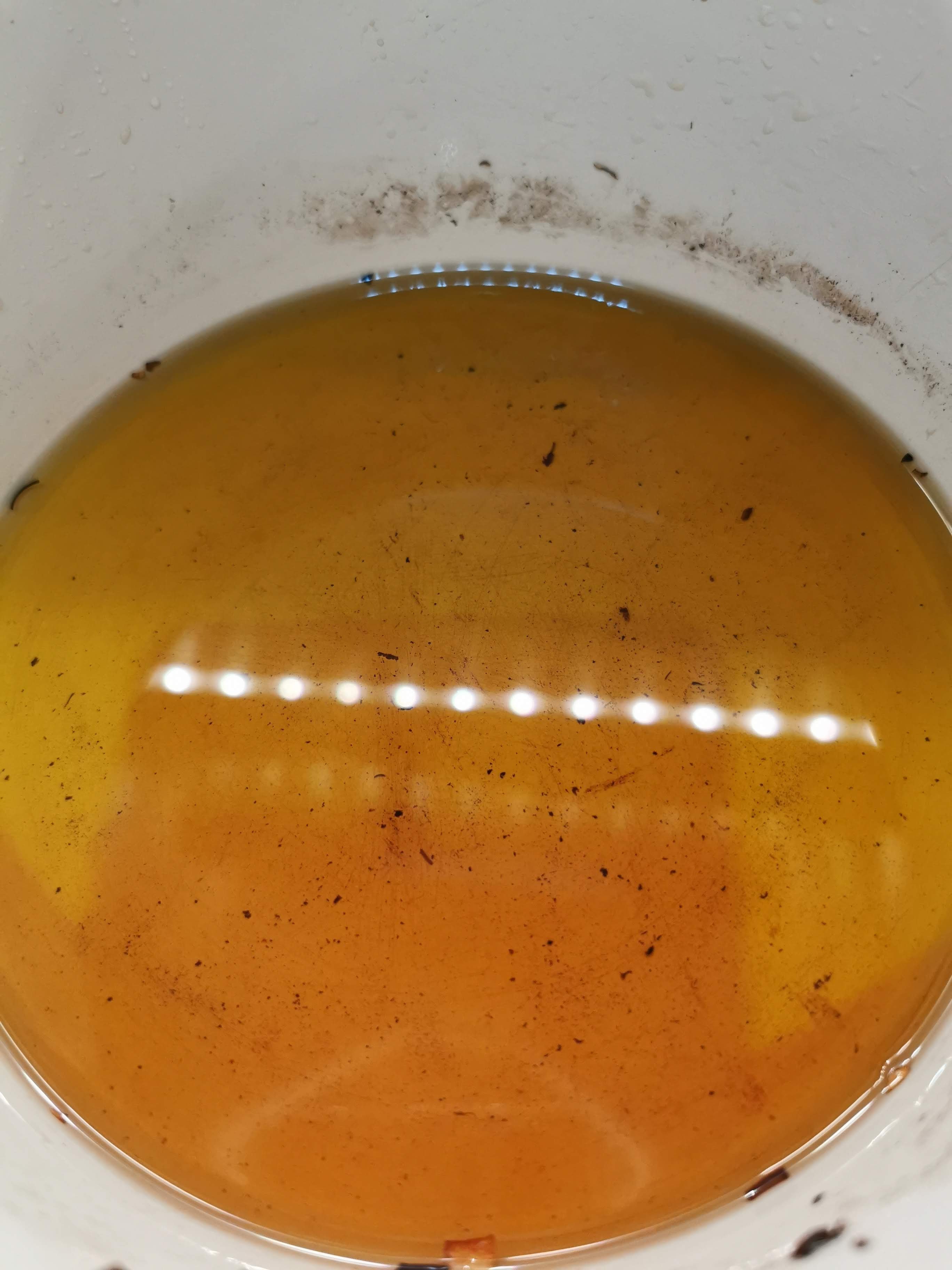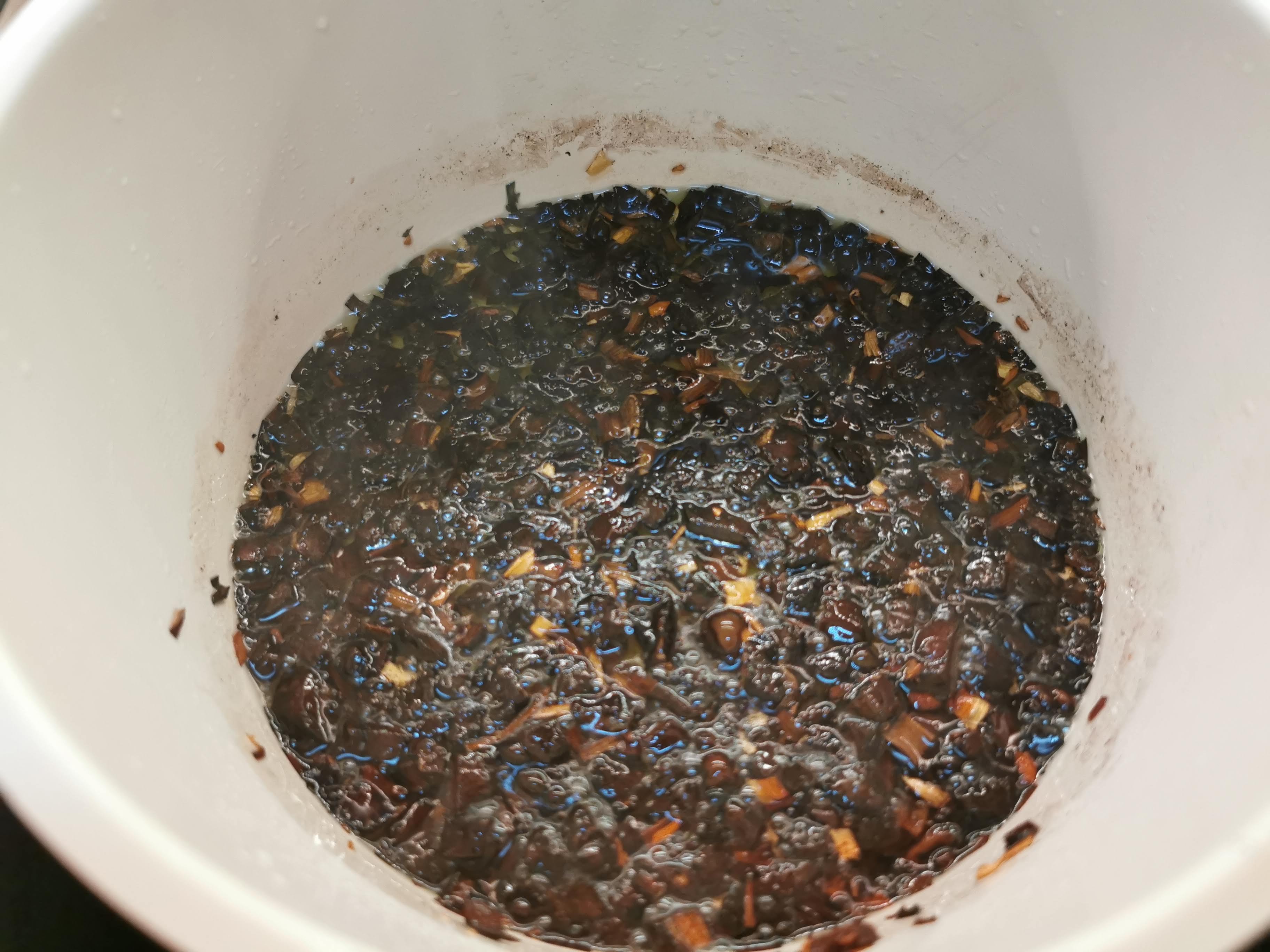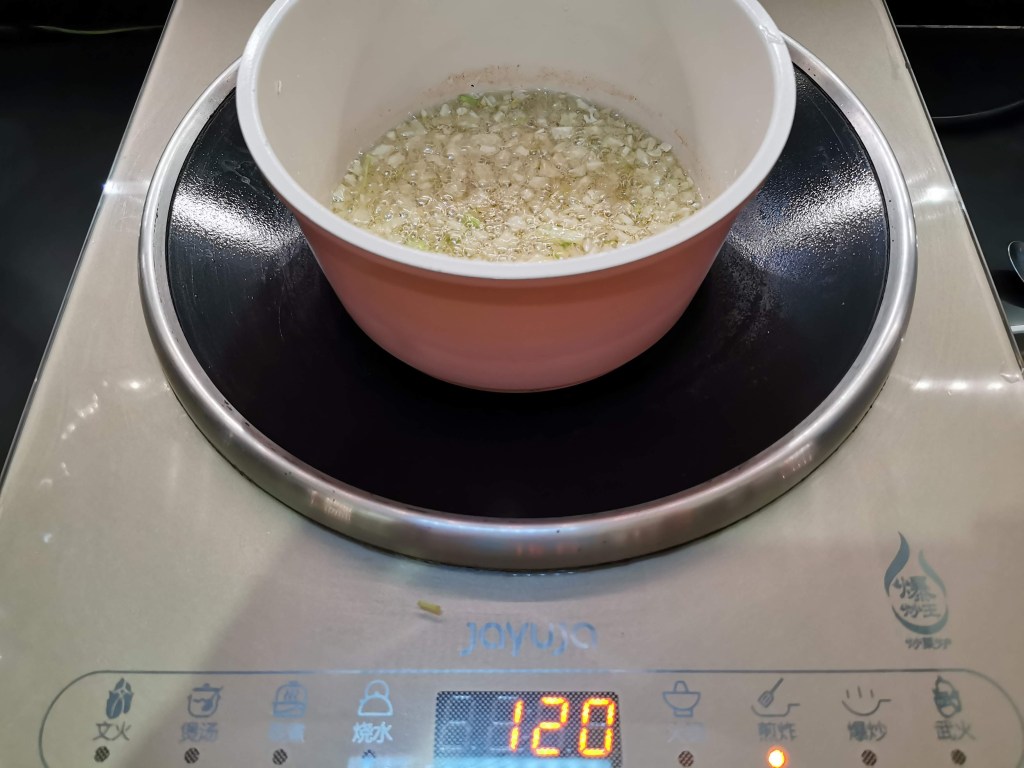 把蒜頭及大蔥切碎,準備小鍋,先燒熱油,放入蒜蓉及大蔥碎,用最慢火 (大約120-140度),耐心地炸蒜蓉至黑色,然後盛起黑蒜,備用 Chop garlic and leek into small pieces, then prepare a small pot, high the oil, then put garlic and leek in, and keep the temperature around 120-140 degree celsius, cook and monitor the garlic until black, then take out all the garlic and leeks, finished and set aside.