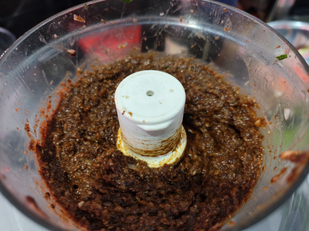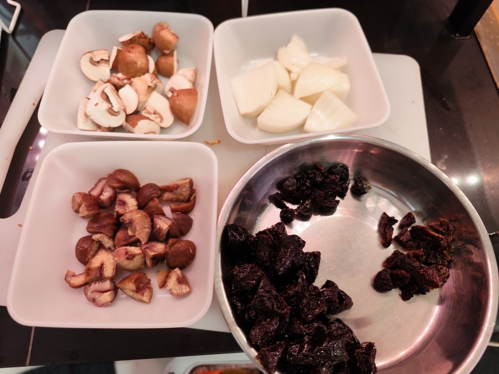 First, prepare the filling – onion, mushroom, chestnut, dried prunes and raisin cut into cube, use butter to stir fry onion and mushroom until soft, then put it and other ingredients with garlic, rosemary, thyme, red wine (10ml), salt and black pepper into mixer, make a paste form, set it aside.