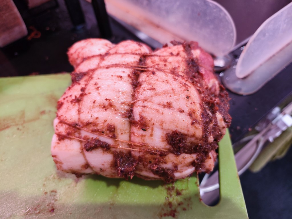 Prepare the pork belly, open it into butterfly form, put some salt and black pepper and put the filling on the top, then roll it up carefully and tight it up (sorry for my picture, it’s overstuffed, the amount had been adjusted in this recipe)