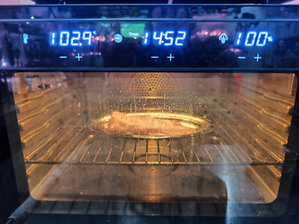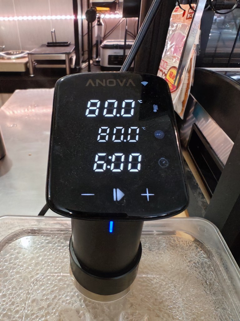 Then, put into vacuum bag and cook it in 77 degree celsius for 14 hours