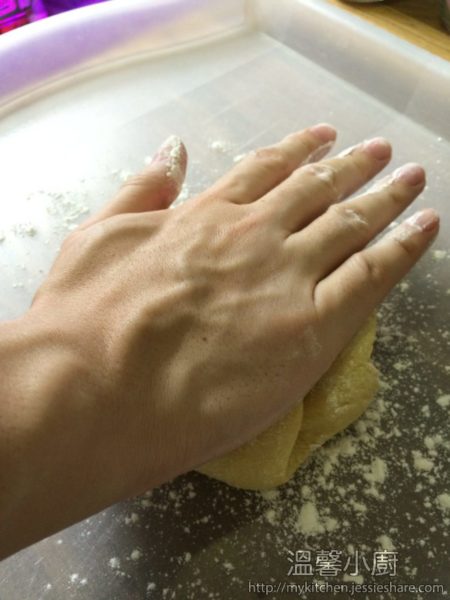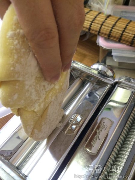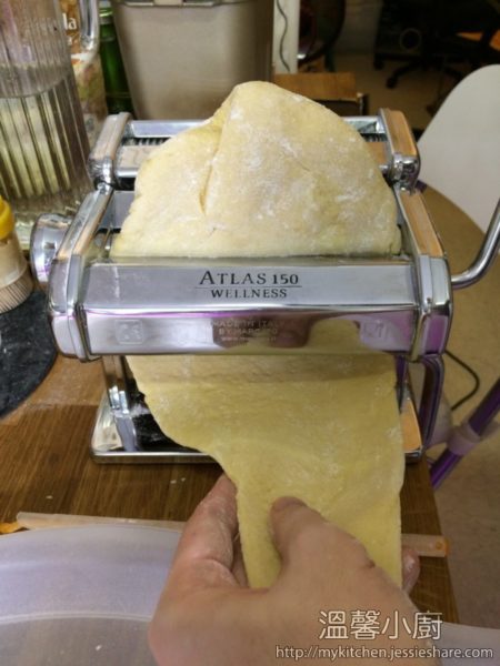 取出麵糰後,灑上手粉,把麵糰分半,輕輕壓扁麵糰,調教麵條機的厚度為”0″,把麵糰放上及攪動麵條機,當麵糰壓扁後對摺,又再放入麵條機攪動,重複幾次後,感覺到麵糰有點乾的時候,可以把麵條機調高為”1″,又把麵糰壓扁,跟著每壓一次就調高麵條機一度,直至厚度為什為”4-5″,然後把壓扁了的麵糰灑上手粉,分為一半,最後放在不同的麵條機上攪動,就完成麵條了。