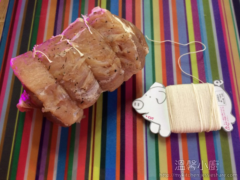 2. 準備好紮肉的綿線,把腩肉卷好,依以下方法紮好