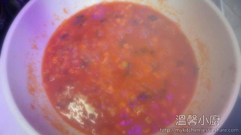 8. 再加入番茄碎或意大利番茄醬 (如果用罐頭番茄碎就得加入蘿勒葉了)