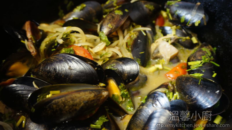 3. 放入青口略炒,倒入白酒,蓋上,待大約5-10分鐘,打開蓋,檢查是否所有青口已打開