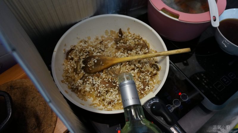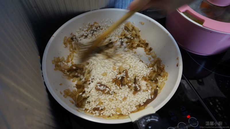 4. 加入牛肝菌,伴勻後再加入意大利米,再伴勻