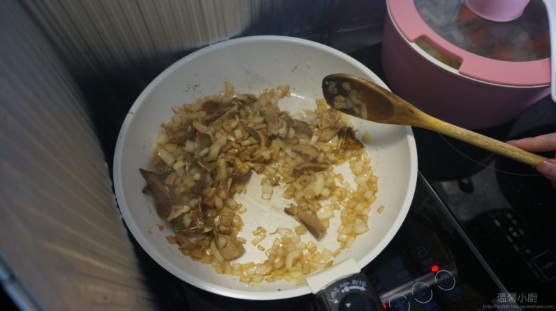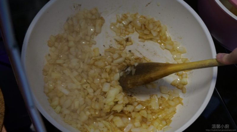 3. 在同一個鍋,加入橄欖油,加入洋蔥炒至軟身