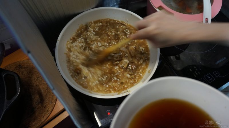 6. 再加入浸牛肝菌的水,一邊煮一邊攪