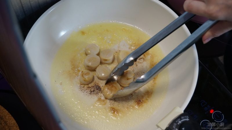 2. 準備一個平底鍋,放入牛油,當牛油溶化,加入帶子煎至兩邊金黃,盛起備用