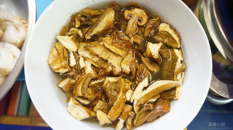 1. 把乾牛肝菌浸於水中20分鐘、洋蔥切小粒、清洗帶子及吸走水份