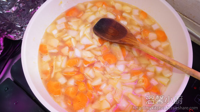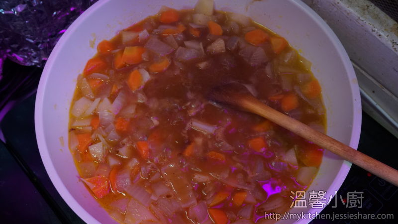 9. 回到咖喱,15分鐘後加入咖喱磚並攪拌至咖喱磚完全溶解,再繼續小火煮多5-10分鐘至自己喜歡的濃縮度