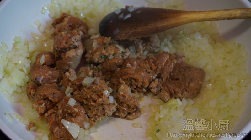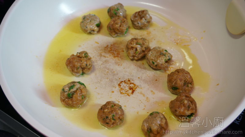 10. 另一方面,用另一個平底鍋,把香腸球用小火煎至小許金黃色,再加入少量白酒,再煮一會就關火備用