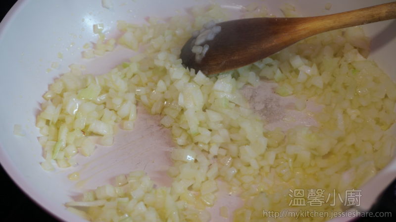 5. 準備另一個平底鍋,先下油,再下洋蔥粒炒至軟身