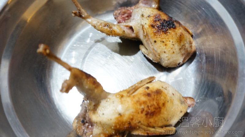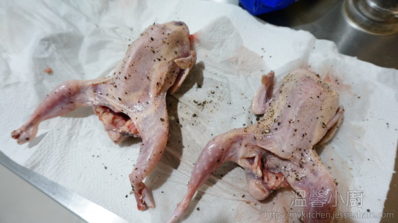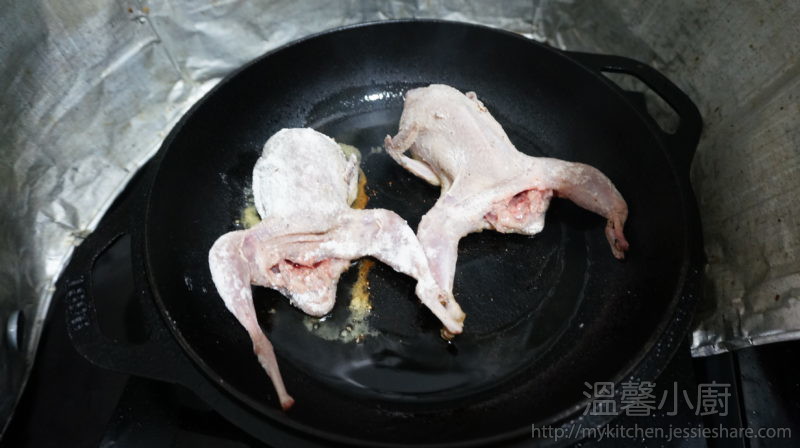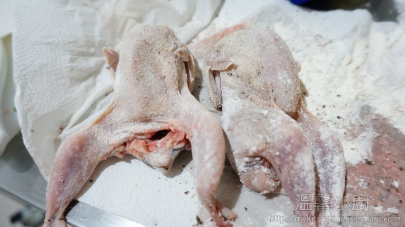 1. 鵪鶉清洗後,用廚房紙抹乾,用鹽及胡椒粉醃一下,用麵粉灑滿全身