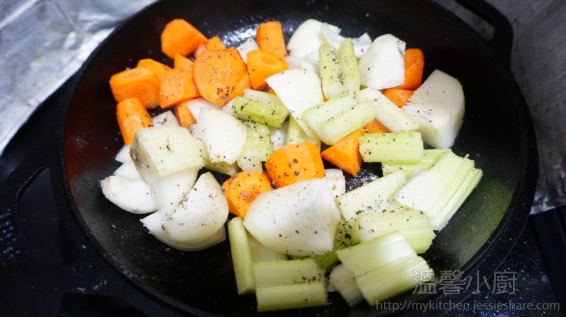 5. 同一個鍋,加入洋蔥、鹽及黑胡椒粉炒至軟身