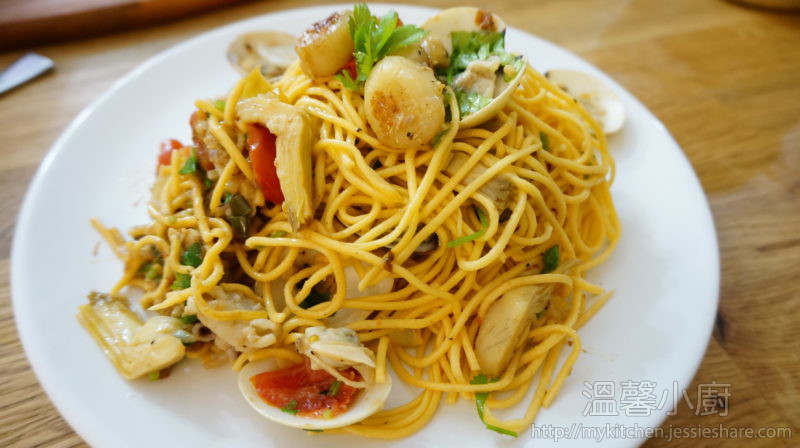 6. 把之前的海鮮回鍋,快伴勻後,加入意粉及蕃茜伴勻,最後加上檸檬汁就完成。