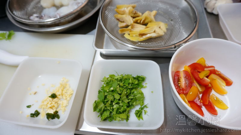 2. 雅枝竹及車厘茄分別切開成四件,蒜頭、辣椒及鯷魚切碎,備用 (如果用新鮮雅枝竹,先用滾水煮過10分鐘)