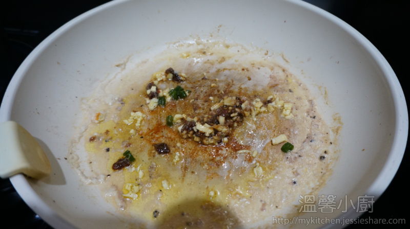 3. 由於海鮮有不同的生熟度,所以要耐心地每樣每次先煎或煮過海鮮,然後盛起,備用。例如 : 帶子或蝦先用牛油煎香、蜆肉或青口用白酒煮過等等
