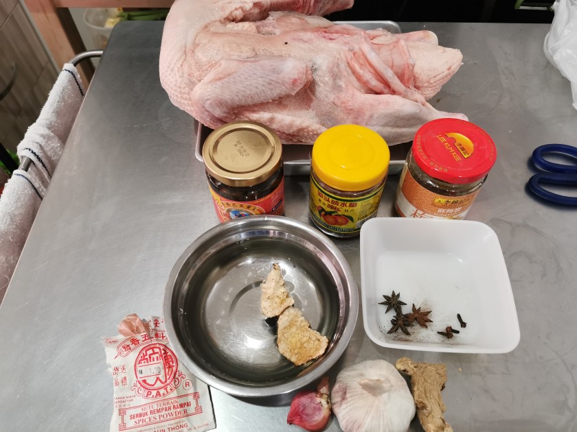 4. 把用完的油倒去,洗一洗鑊,烘乾後,把蒜頭、蔥、紅蔥頭、薑、八角及丁香炒至香氣出來,再加入水、豉油、老抽、五香粉、冰糖、白胡椒、麻油、酸梅、鹽、陳皮、蘇梅醬及磨豉醬煮至濃縮狀態,最後加紹興酒,收火待涼一下