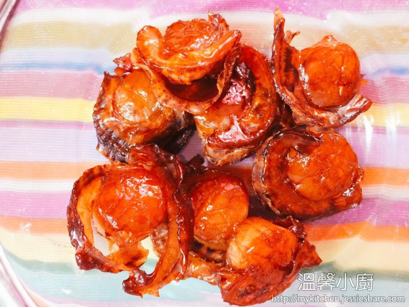 最近見急凍北海道熟帶子在超市大特價,作者大膽地買回來試做這個小食,希望重拾這味道。讀者可以買生的也可以,但先用鹽水汆水一會,不然就很容易散開的。