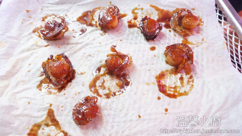 Prepare dehydrating tray, put on the baking paper, dip the scallops into the sauce, and put it in the tray, then glaze some honey and put some sauce on the top