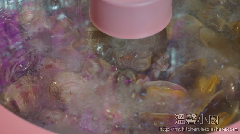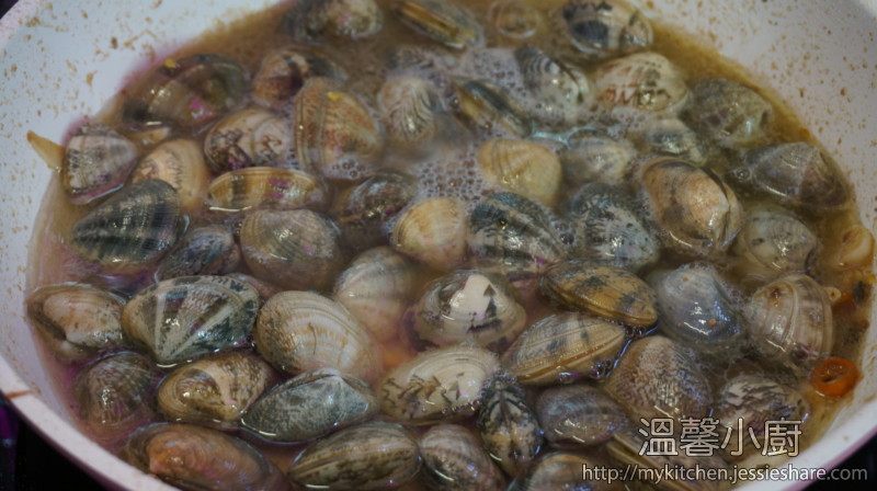 4. 再加入蜆仔及白酒,煮一會,待酒精揮發後,蓋上待蜆仔打開