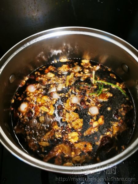 Stir fry all spices until smell fragrance without oil, then put all the spices into a tea bag ( for sichuan red peppercorn only use 2 teaspoons)
