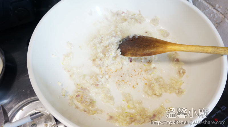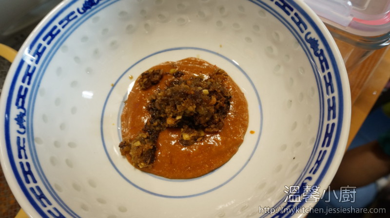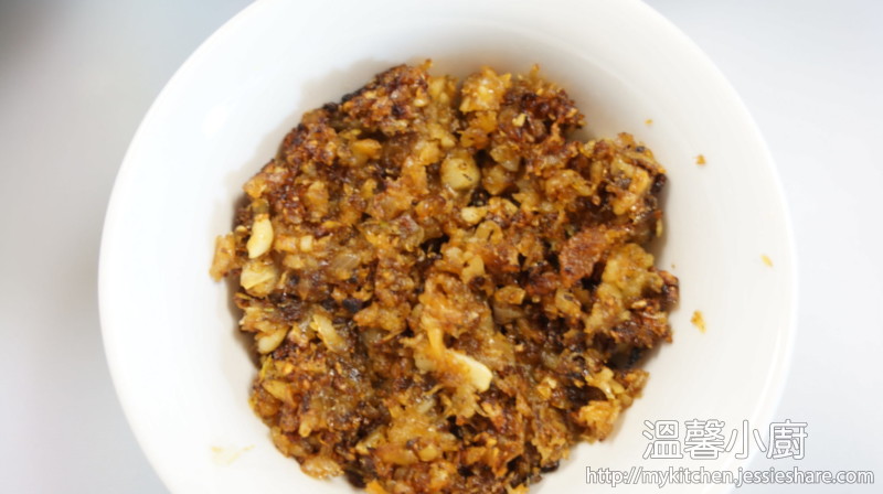 12. 把1/2條大蔥切碎,把炒好的花椒粒(只用3茶匙)壓碎,把兩者撈勻,備用