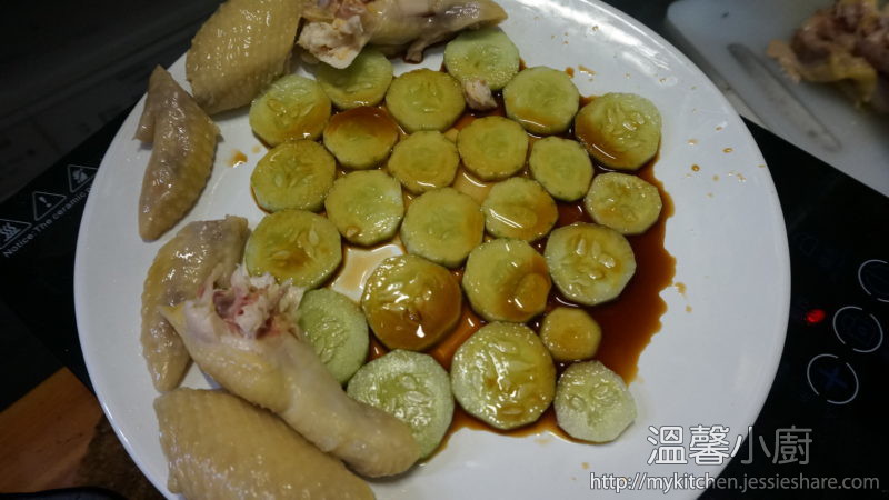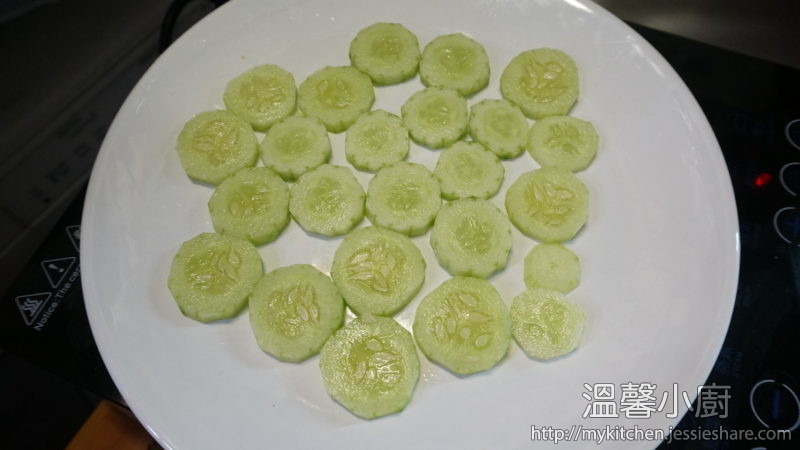 11. 準備一個大碟,把青瓜切成一片片,鋪在碟上,平均地倒入少許豉油及麻油