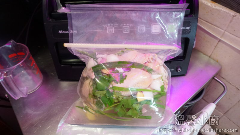 2. 準備一個大型慢煮袋,先把雞清洗好,用鹽擦內外,把雞、蔥段、薑、班蘭葉、紅蔥頭、開水及鹽放入袋內,用anylock封好,就可以用真空機封口,不用抽真空。